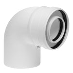Curva di raccordo ad angolo di  90° per Sistemi Fumari di Apparecchi Tradizionali Coassiale  Polipropilene / Polipropilene  Ø 60/100  Curva M/F Con guarnizione in silicone  Colore : Bianco RAL 903